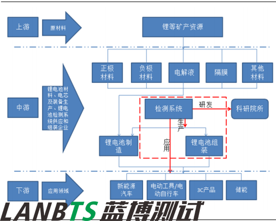 鋰離子電池產(chǎn)業(yè)鏈上游為:鋰礦產(chǎn)資源--中游為鋰電池材料--電芯生產(chǎn)--電芯生產(chǎn)裝備--鋰電池檢測(cè)系統(tǒng)提供商和鋰電池組裝企業(yè)--下游主要是鋰電池配套應(yīng)用領(lǐng)域,包括 3C 產(chǎn)品、電動(dòng)工具、電動(dòng)自行車、新能源汽車、儲(chǔ)能等行業(yè)。
