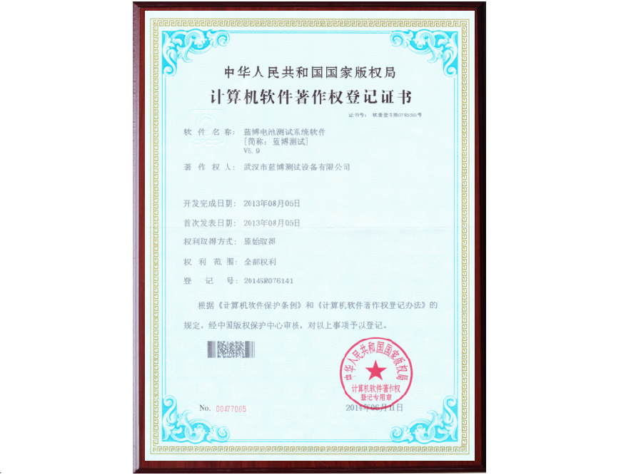 根據《計算機軟件保護條例》和《計算機軟件著作權登記辦法》的規定,經中國版權保護中心審核,中華人民共和國國家版權局對藍博公司提交的電池測試系統軟件著作權認定為原始取得并予以登記,從頒證之日起,這套電池測試系統軟件的版權將得到中國版權保護中心的有效保護。
